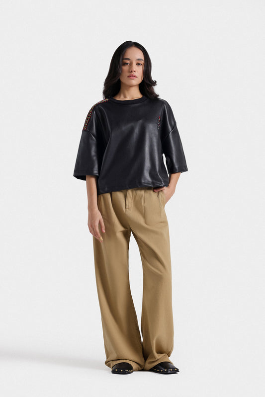 Cropped Faux Leather Embroidered T-shirt